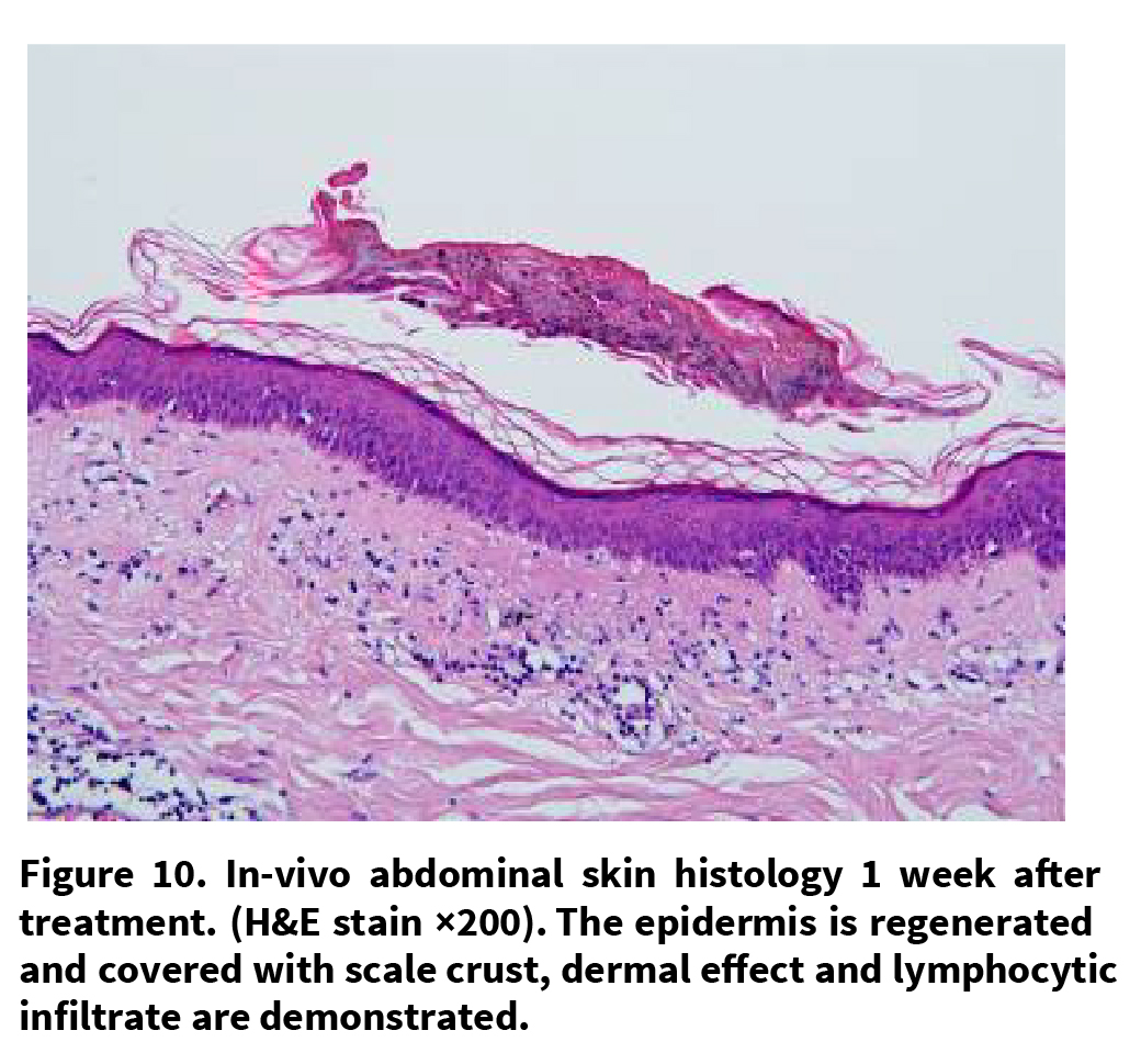 Samples were taken 1 week after treatment show intact (regenerated) epidermis in foci covered with scale crust (sign of previous damage). Dermal collagen-affected areas are demonstrated. Minimal lymphocytic infiltrate was present (Figure 10).