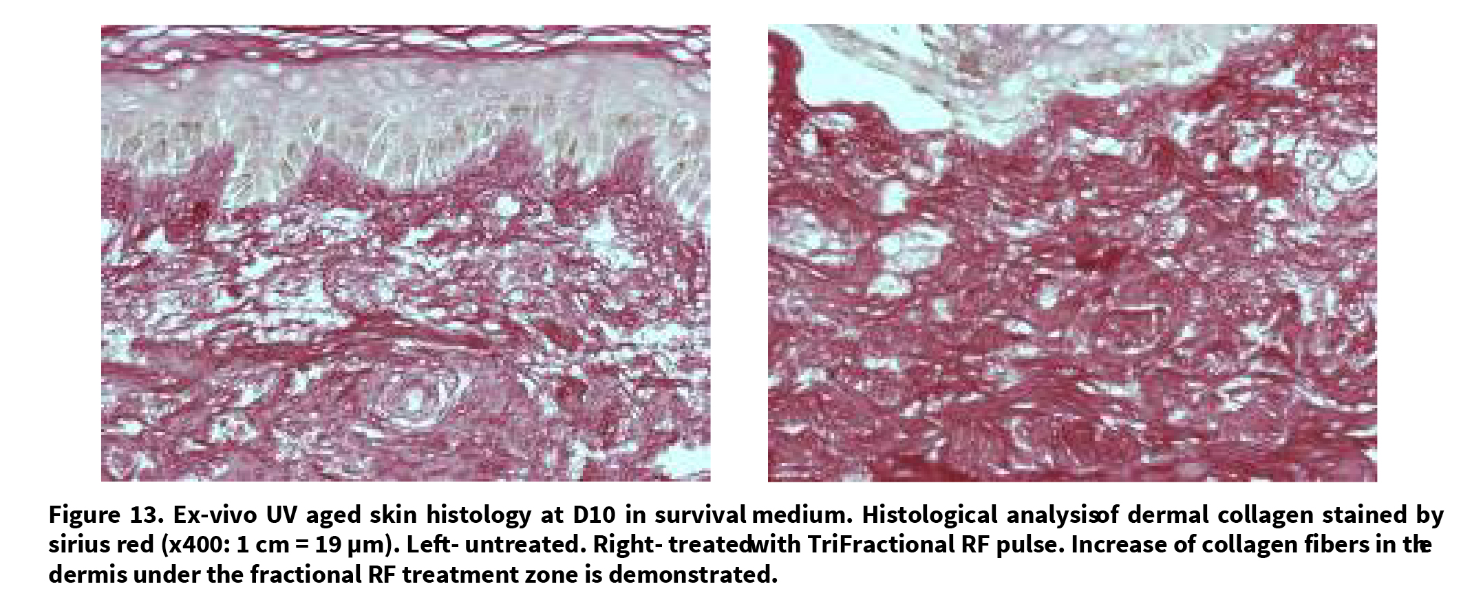 Morphometry of collagen revealed a statistically significant augmentation from 62.7% ± 1.75% average collagen for experimentally aged skin to 72.5%± 4.07% collagen for skin treated by fractional RF (p = 0.00019). This corresponds to 15.5% increase of collagen content Figure 13.