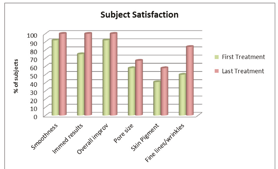 After the last treatment, all subjects noted an improvement in skin smoothness, immediate results and an overall improvement of skin feeling. 67% of subjects noted a decrease in pore size. 58% reported an improvement in skin pigmentation and 84% noticed an improvement in fine lines and wrinkles.