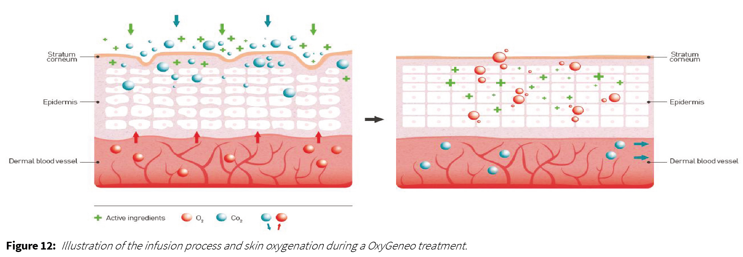 Similarly, the unique texture of the Capsugen induces a light peeling of the skin’s outer layer enabling better infusion of the active ingredients deep into the epidermis. The increased circulation in the treated area enhances homogeneous absorption of the active ingredients and the OxyGeneo technology exponentially increases the effectiveness of the active ingredients. The increased oxygenation in the cells and increased metabolism aid in enhanced absorption of the active ingredients. An illustration of the process is demonstrated in Figure 12.