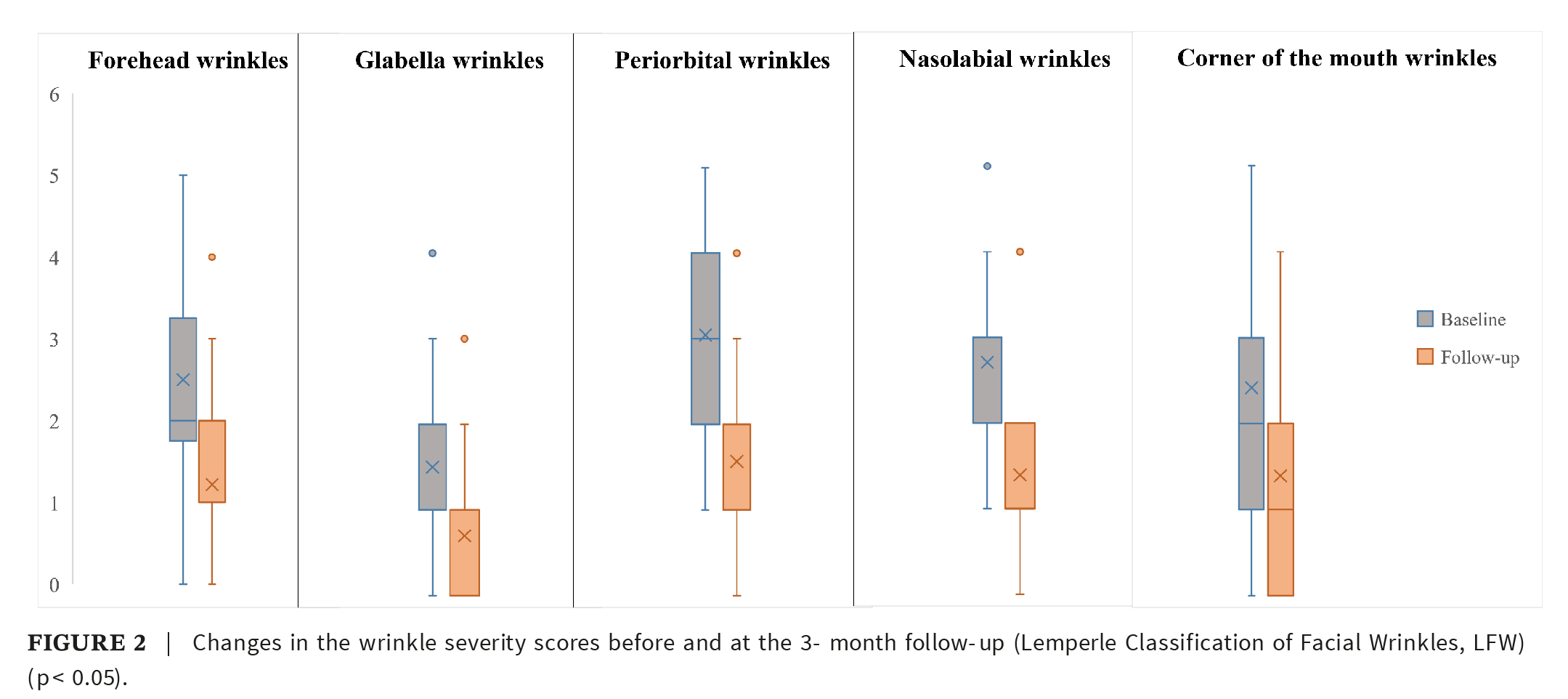 Data analysis revealed a decrease in the aggregated facial LFW score 3 months after the last treatment, from baseline mean 13.00 ± 4.75 to 6.09 ± 3.90 (p < 0.05). The wrinkle severity was significantly lower in forehead, glabella, periorbital, nasolabial, and corner of the mouth areas (p < 0.05) (Figure 2).