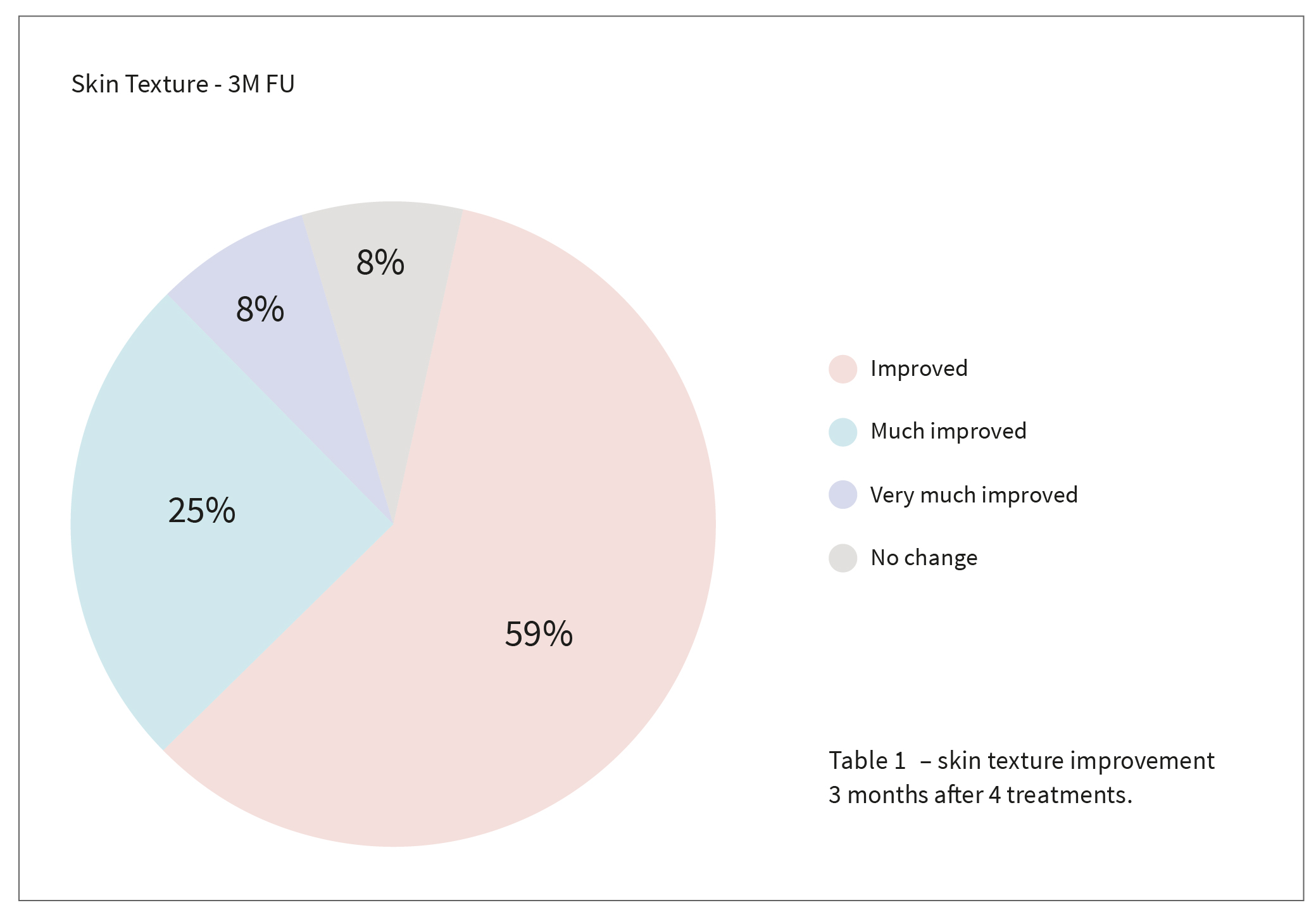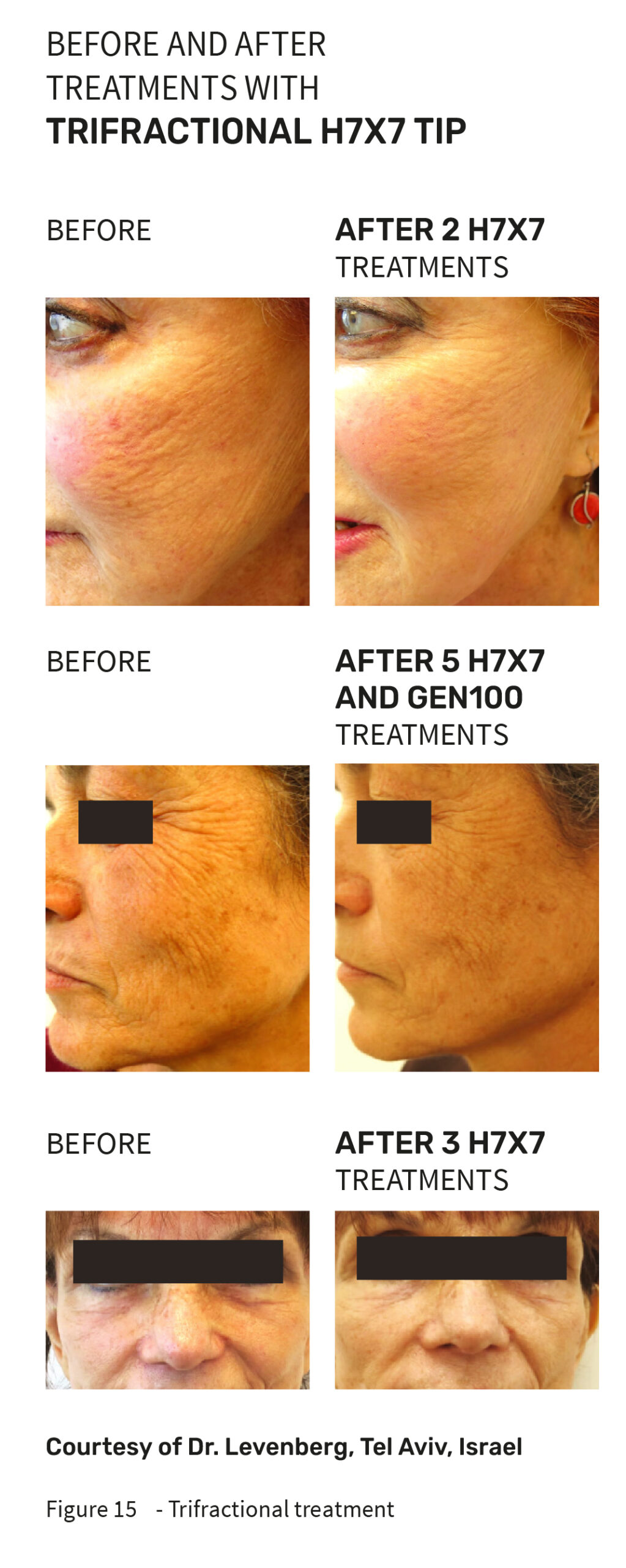 A clinical evaluation of skin texture improvement and wrinkle reduction using Fractional RF resurfacing with TriFractional H7x7 tip (Pollogen, 2019) A recent clinical evaluation of the TriFractional H7x7 tip (Pollogen, 2019) for skin texture improvement and wrinkle reduction provide evidence of the safety and efficacy of the treatment. Twelve females, ages 29-60 (50±9), Fitzpatrick skin type II-IV, received four full face TriFractional treatments at 3-weeks interval. All patients returned for 1 and 3 months follow up. Efficacy: Treatment was well tolerated; pain levels remained low throughout the study and no topical anesthesia was required. Improvement in brightness and wrinkles noticed by patients from the first treatment. All patients (100%) saw overall improvement at 1 month follow up and 93% of patients saw improvement in skin texture at 3 months follow up. See additional details in table 1. Most of the patients (75%) reported positive self-assessment changes in all treatment areas following second treatment. Moreover, although not specified as treatment indication, 25% reported an improvement in their acne scars as an additional benefit. Safety: Transient erythema and edema observed in all patients lasting for a few hours. No adverse events were reported before, through and after the treatment. Downtime: All patients reported that they felt comfortable to go out in public one day after the treatment. Conclusion: H7x7 TriFractional treatment found to be safe, well tolerated and effective for skin texture improvement, with minimal discomfort and downtime resulting in improved brightness, skin tightening and wrinkle reduction (Figures 1-4).