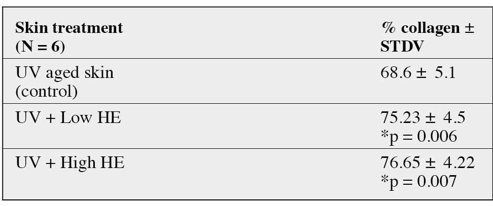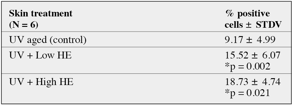 *Statistically significant difference in comparison with control UV aged skin. (Paired Student T test, p<0.05)