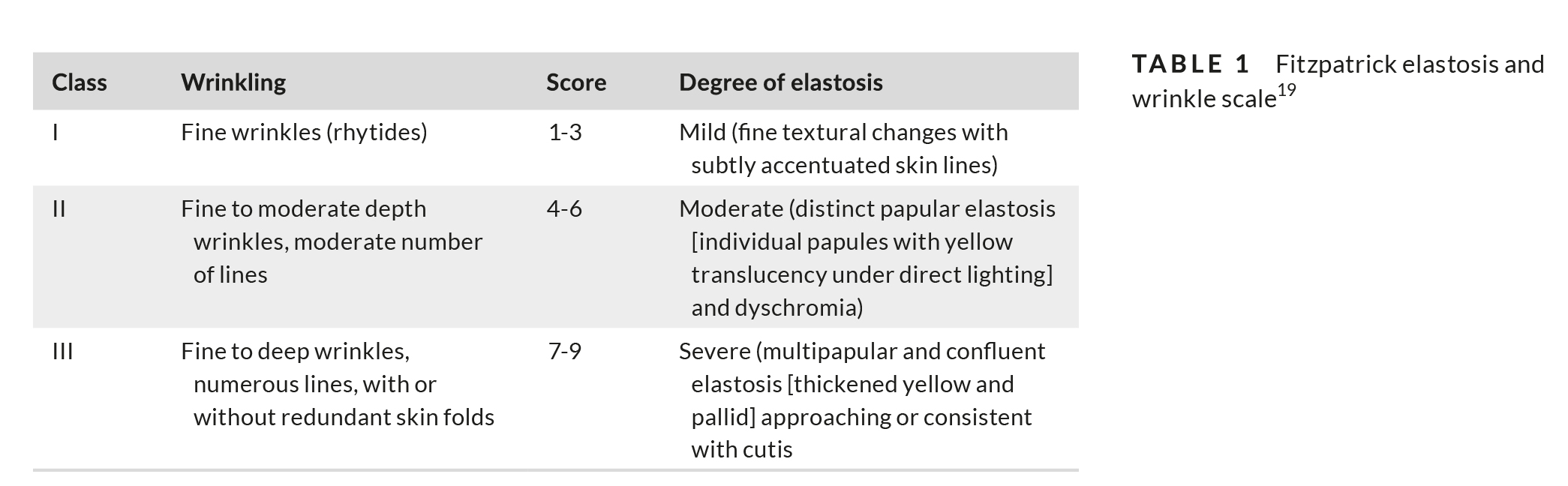 The investigator and subjects independently graded the skin’s improvement by comparing the subject’s visual appearance at fol-low-up against an archival photograph taken at baseline. Evaluator-rated change in skin texture and wrinkles was evalu-ated by the FES.