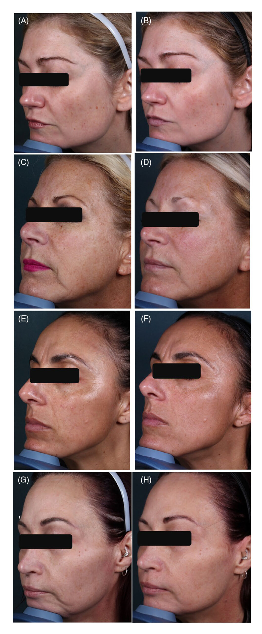 FI GUR E 5 Representative “before and after” photographs of study participants. A 37-y-old female patient, before (A) and 3 mo after six treatments sessions (B). Significant improvements were noted in skin tightness, nasolabial folds, and marionette lines. A 49-y-old female patient, before (C) and 3 mo after six treatments sessions (D). Significant improvements were noted in skin tightness, fine lines, and wrinkles. A 45-y-old female patient, before (E) and 3 mo after six treatments sessions (F). Significant improvements were noted in skin tightness, nasolabial folds, and skin texture. A 47-y-old female patient, before (G) and 3 mo after six treatments sessions (H). Significant improvements were noted in skin tightness and wrinkles
