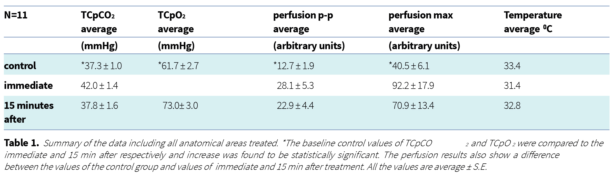 The perfusion is statistically significant higher immediately after the treatment (P<0.005) while 15 minutes after the treatment the values are still higher than the baseline (P=0.01) but not statistically significant. Thermal monitoring of all body areas showed no significant temperature fluctuations at the treatment area post treatment. The skin temperature declines about 2ºC (due to evaporation cooling), while 15 min after treatment the temperature restores toward baseline.