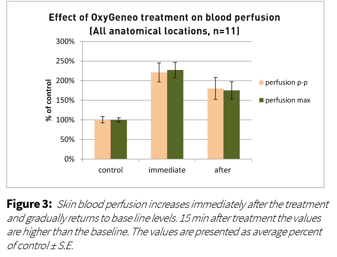 Methods: To investigate the OxyGeneo treatment mechanism, an evaluation of blood perfusion and tissue CO2 and O2 levels was conducted on 11 subjects on different anatomical areas. Measurements were performed at baseline (before treatment), immediately after and 15 minutes post a 10 minute OxyGeneo treatment.
