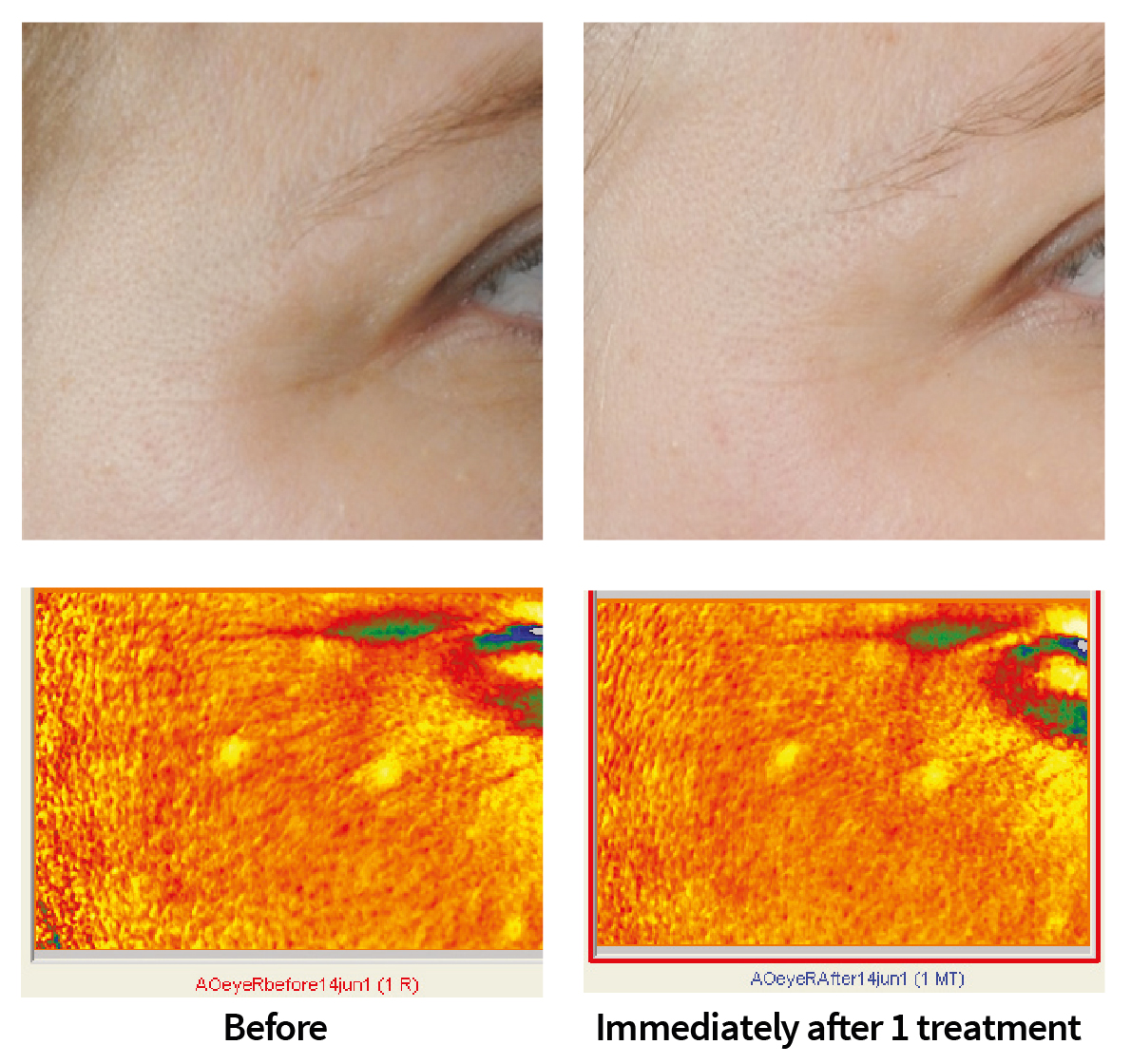 Digital photographs of subjects demonstrated an overall improvement in skin appearance immediately after treatment and following last treatments. Treatment effects included a general improvement of skin texture, indication for reduction of pore size and general brightening of skin tone. In some cases a visible improvement of periorbital wrinkles was noticed.
