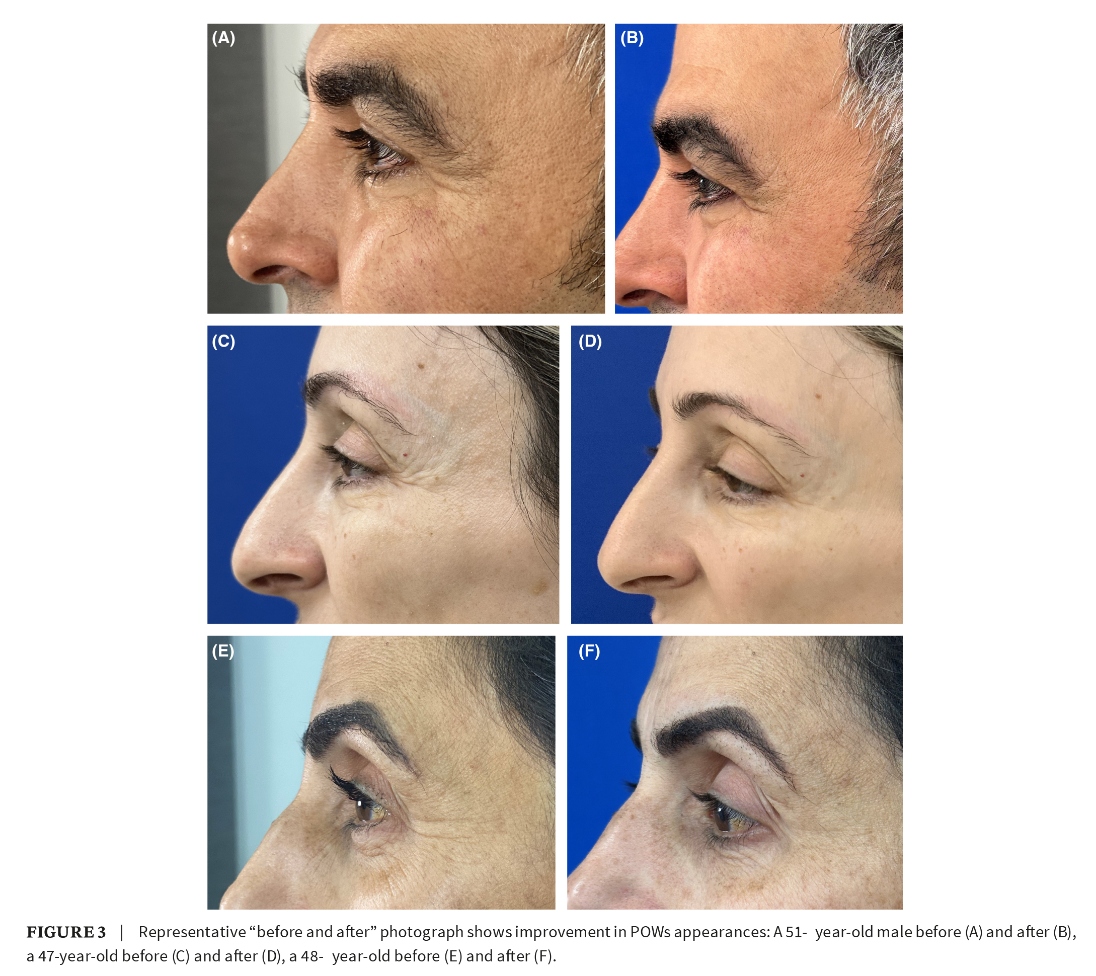 A prospective, single-center study was conducted in accordance with the ethical principles set out in the Declaration of Helsinki 2000. Male and female candidates with shallow-to-deep POWs were enrolled in the study and signed consent forms including photo-publishing permission. Pregnant or lactating females, patients with history of keloids, active infectious or inflammatory skin conditions, recent filler/neurotoxins injections, ablative skin resurfacing, lifting surgery, isotretinoin, or retinoids therapy were excluded.