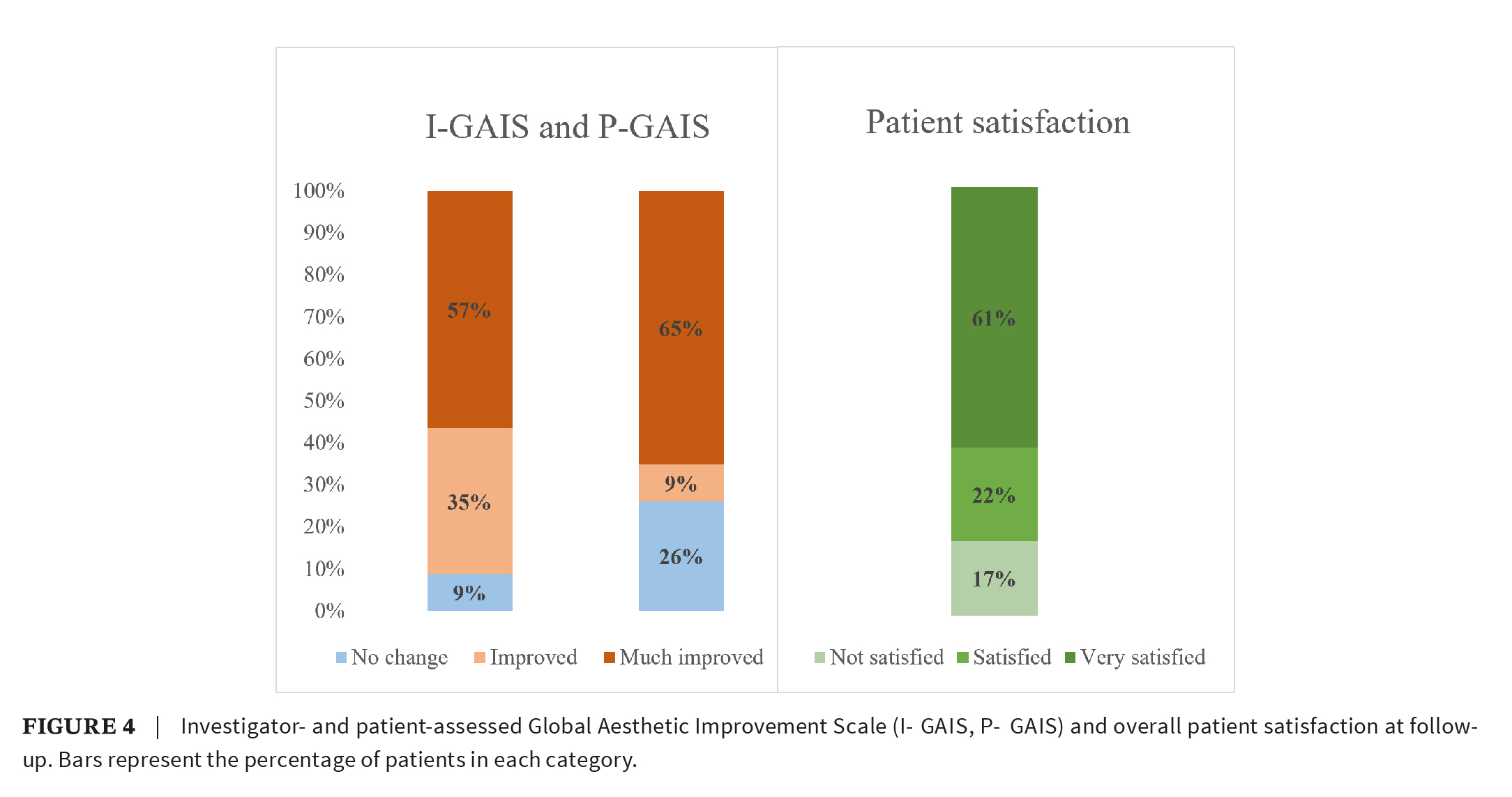 Overall severity of the periorbital wrinkles was diminished for at least one grade in 96% of participants, with an average 49% decrease of the LFW score (p < 0.05). Representative “before and after” photographs showed improvement in POWs appearances (Figure 3). Photography images taken at the follow-up were independently evaluated by the investigator (Investigator Global Aesthetic Improvement Scale, I-GAIS) and patients (Patient Global Aesthetic Improvement Scale, P-GAIS) by answering the GAIS questionnaire. There was a physician/patient agreement in the grade of the observed improvement: an average of 4.5 and 4.4, respectively. Patient rated POWs “improved” or “very much improved” in 71%. Eighty-three percent of the study population reported satisfaction with the comfort, recovery time, and the treatment results (Figure 4).