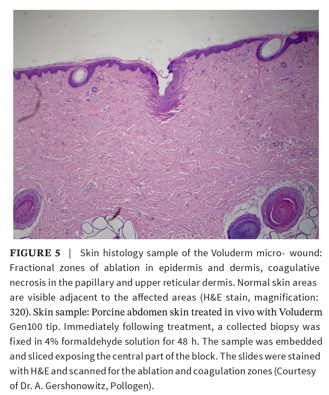 Minimally invasive radiofrequency microneedling generates high heat and creates fractional zones of ablation in the dermis. By inducing bulk heating RFMN generates several thermo-biological factors synergistically contributing to regeneration of dermal wrinkles [20]. RF-induced ablation activates the wound-healing mechanism and causes cellular infiltration, neovascularization, and formation of granulation tissue. Dispersion of sub-necrotic heat results in fibroblast stimulation and subsequent collagen and elastin neo-synthesis [21]. Healing of the Voluderm micro-wounds revealed inflammation and granulation beginning on day 1, followed by fibrinous tissue completely filling the ablation channel and epidermal epithelization on day 14 [11].