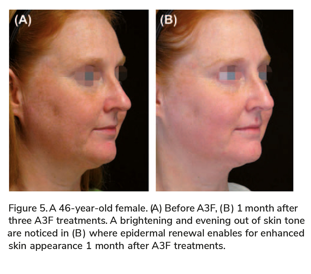 As demonstrated in Figure 4, the A3F treatment was found to be safe and effective for dark skin types resulting in improved skin complexion, evening out of skin tone and imperfections. This result indicates a major advantage of the TriFractional technology over other existing resurfacing options.