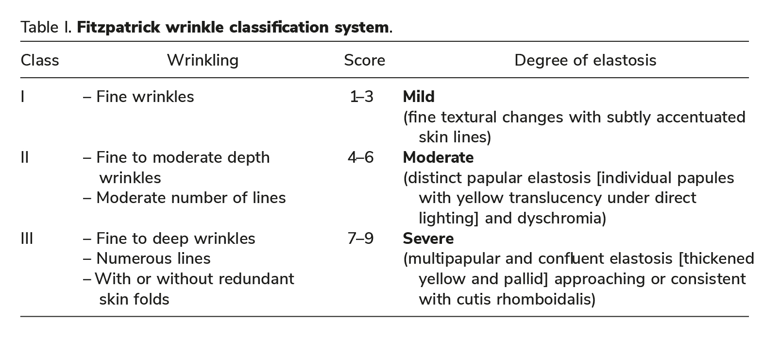 In addition to the effi cacy evaluation established by the blinded evaluators, each Principal Investigator (PI) visually inspected and graded each subject using the Fitzpatrick Wrinkle and Elastosis scale at baseline and at 3 months follow-up visit.