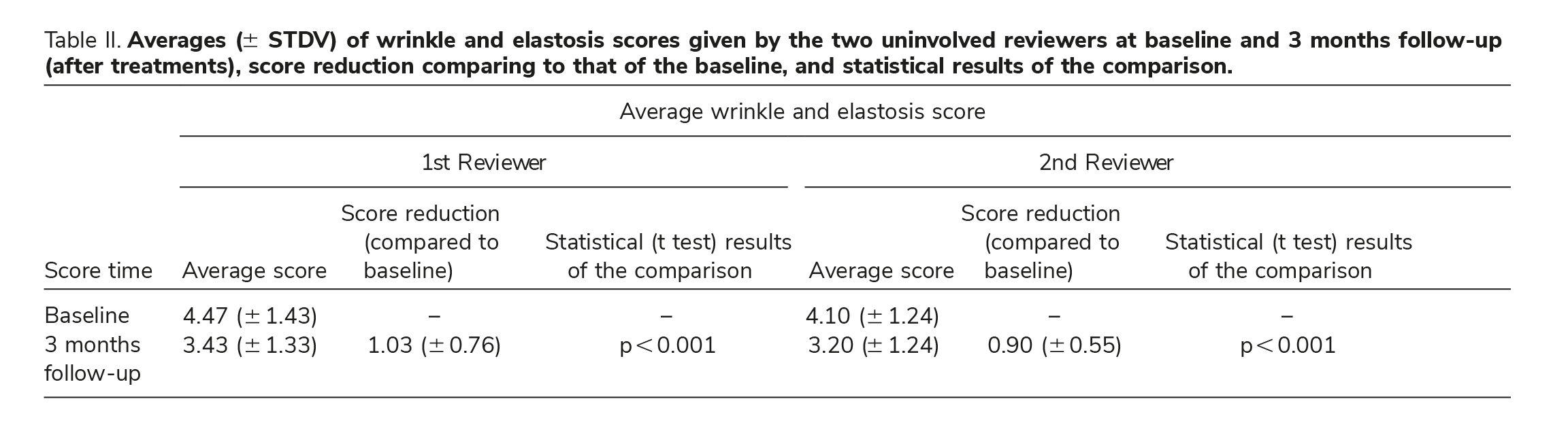 In order to evaluate level of agreement between the two uninvolved physicians, statistical comparison (using two-sided paired t test) was conducted between the baseline wrinkle and elastosis score pro-vided by the two blinded reviewers. The statistical analysis failed to reveal signifi cant differences (p 0.05) between the baseline wrinkle score of the two reviewers. Furthermore, same result was obtained while comparing the 3 months follow-up scores of the two reviewers. The statistical comparison of the 3 months follow-up wrinkle and elastosis score, obtained by the two uninvolved evaluators, indicates no statistical difference (p 0.05) between the two reviewers. These results indicate that both uninvolved reviewers were in agreement regarding wrinkle and elastosis degree, at baseline as well as at 3 months follow-up, enhancing the study results. Table II sum-marizes the uninvolved physicians score at baseline and 3 months follow-up.