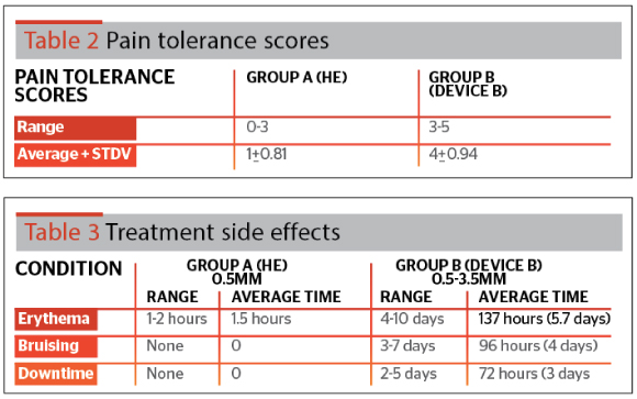 Satisfaction rates of subjects in group A was slightly higher compared to satisfaction rates in group B even though results were similar. This is probably due to the more painful procedure and longer downtime in Device B, which included hematomas, temporary edema, and erythema for several days.