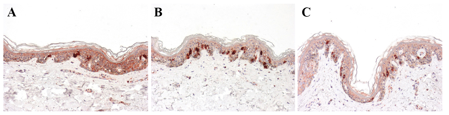 Figure 3. Immunohistochemical analysis of mitotic index at D2 (Ki67, ×200). A significant augmentation of positive epithelial cells is noticed in skin fragment B (UV+Low HE) and in fragment C (UV+High HE) in comparison to the control A (UV).