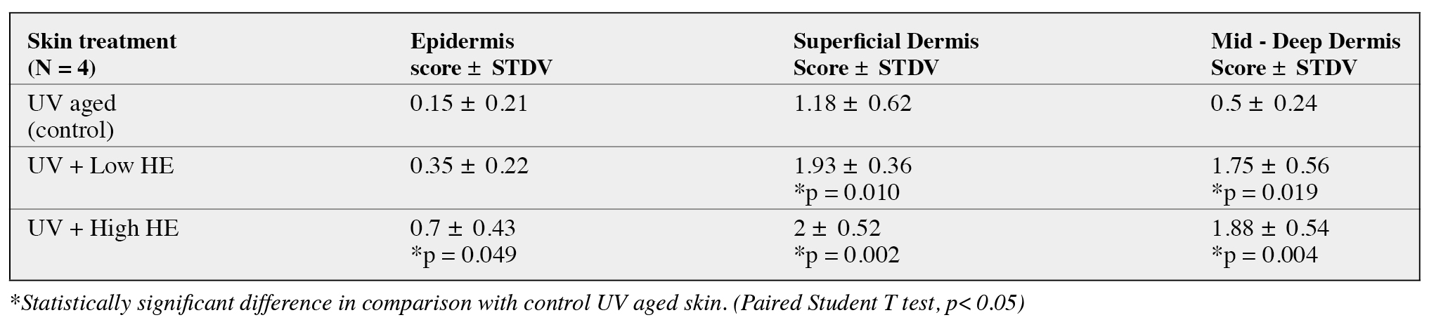 Finally in the mid-deep dermis, a significant augmentation of average GAGs was observed, from 0.5 for experimentally aged skin to an average score of 1.75 for skin adjacent to the area exposed to low levels of HE (p = 0.019). Using high levels of HE resulted in a statistically significant increase of GAGs in the deep dermis with an average score of 1.88 (p = 0.004). Results for the quantification of (GAGs) for 4 donors are expressed in table 3 and in figure 5.