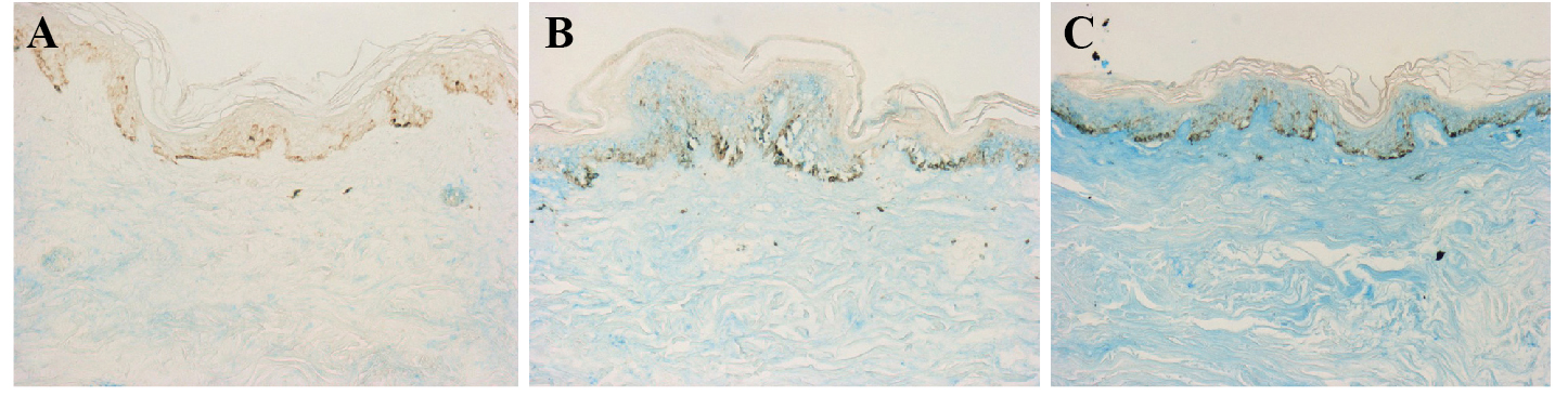 Figure 5. Analysis of GAGs at D10 (Hale staining ×200). A: UV aged control; B:UVaged+LowHE C: UV aged + High HE. GAG augmentation is seen in the epidermis and dermis of skin fragments B and C compared to the control fragment A. Exposure to high HE yielded more GAGs than low HE.