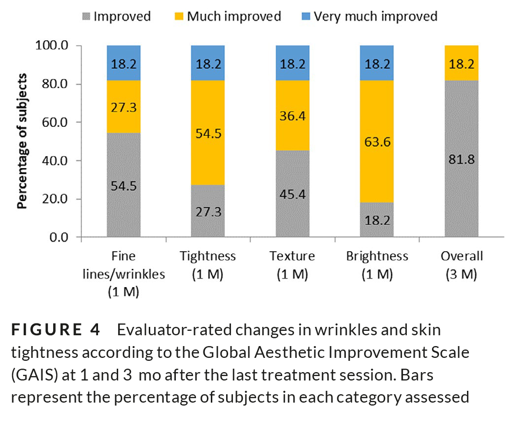 One month after the last treatment session, fine lines and wrin-kles were noted as “improved” in 54.5% of subjects, “much improved” in 27.3%, and “very much improved” in 18.2%. At the same follow-up time point, skin tightness was noted as “improved” in 27.3% of subjects, “much improved” in 54.5%, and “very much improved” in 18.2%. Skin texture was noted as “improved” in 45.4% of subjects, “much improved” in 36.4%, and “very much improved” in 18.2%. Brightness was noted as “improved” in 18.2% of subjects, “much improved” in 36.4%, and “very much improved” in 18.2% (Figure 4). Three months after the last treatment session, investigator-rated overall improvements in fine lines, texture, tightness, and brightness according to the GAIS were noted as “improved” in most subjects (81.8%) and “much improved” in 18.2% of them (Figure 2).