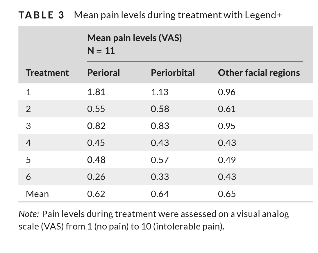 Mean pain levels for all 6 treatments were minimal in all of the treated facial regions: 0.62, 0.64, and 0.65 for the perioral, perior-bital, and the rest of the face, respectively (VAS scale 0-10, Table 3). When assessing pain levels by treatment, mean pain levels were greatest during the first treatment session and decreased during the course of treatment, down to a minimum at the sixth (and last) treat-ment session.