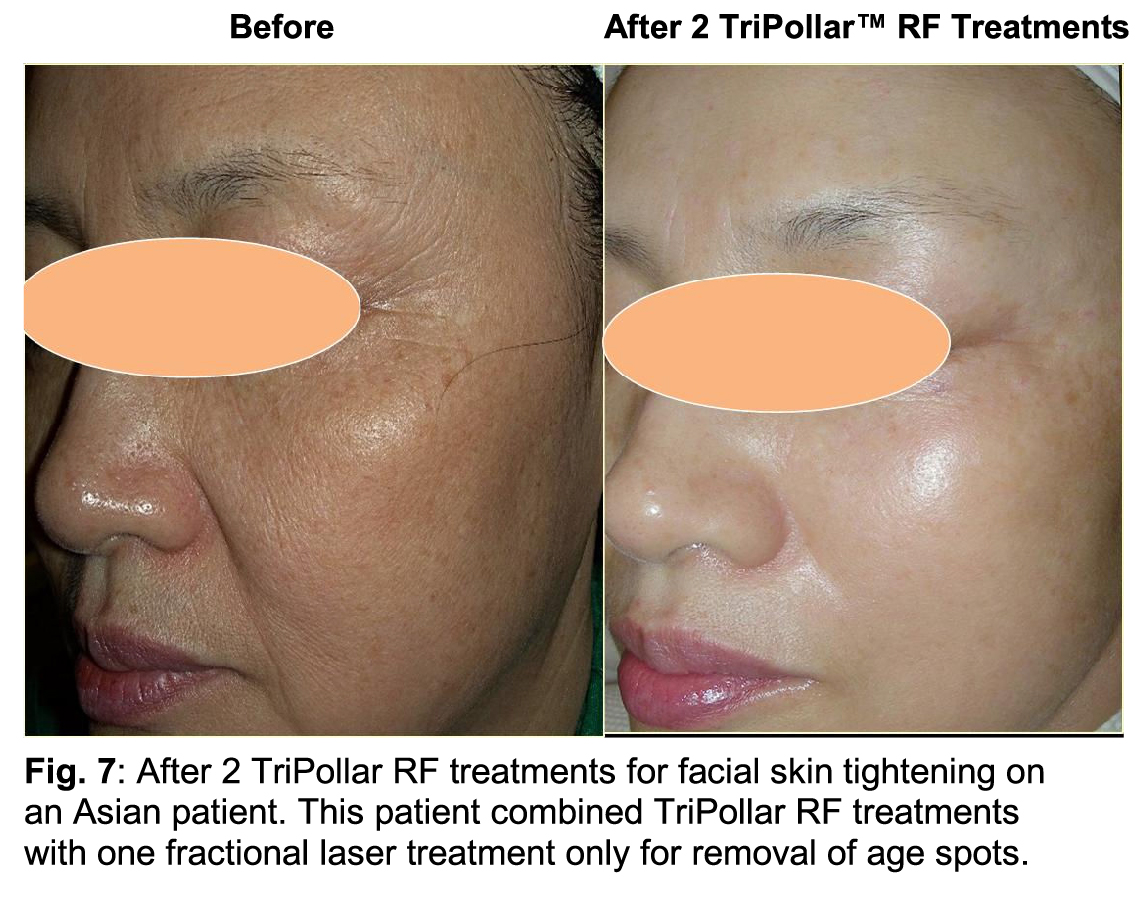 Background It has been well established that Asian skin types are more sensitive to laser or IPL treatments (light-based treatments) due to a larger concentration of melanin in the skin. A new non-ablative treatment modality based on selective electro-heating, TriPollar™ RF Technology, was recently introduced aimed at skin tightening for skin laxity and circumference reduction on facial, neck and arm skin. As this new treatment does not utilize any type of light it is not skin color dependent and is wholly suitable for Asian skin types.